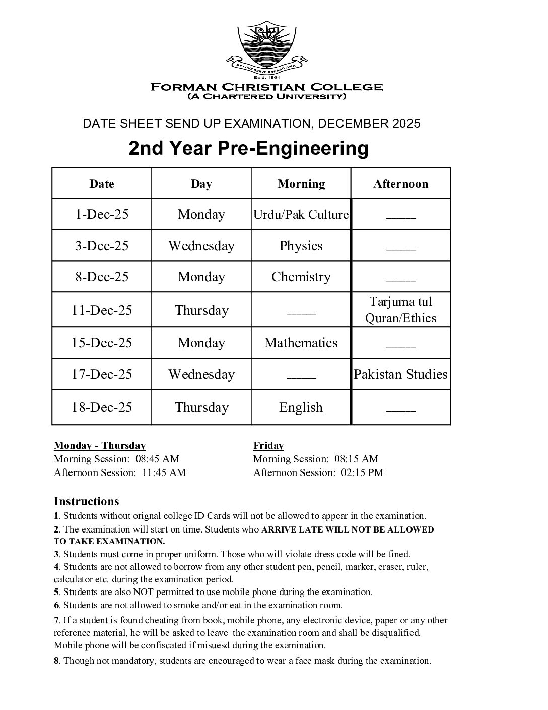 Date Sheets of 1st & 2nd Year Send Up Examinations December 2025