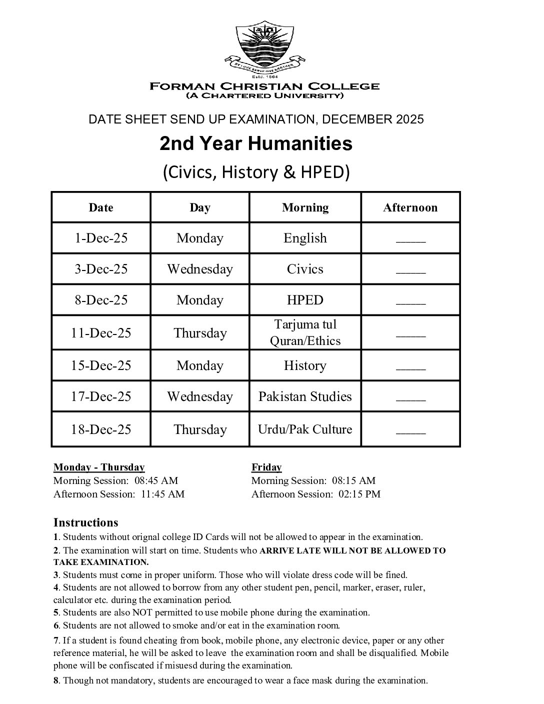 Date Sheets of 1st & 2nd Year Send Up Examinations December 2025