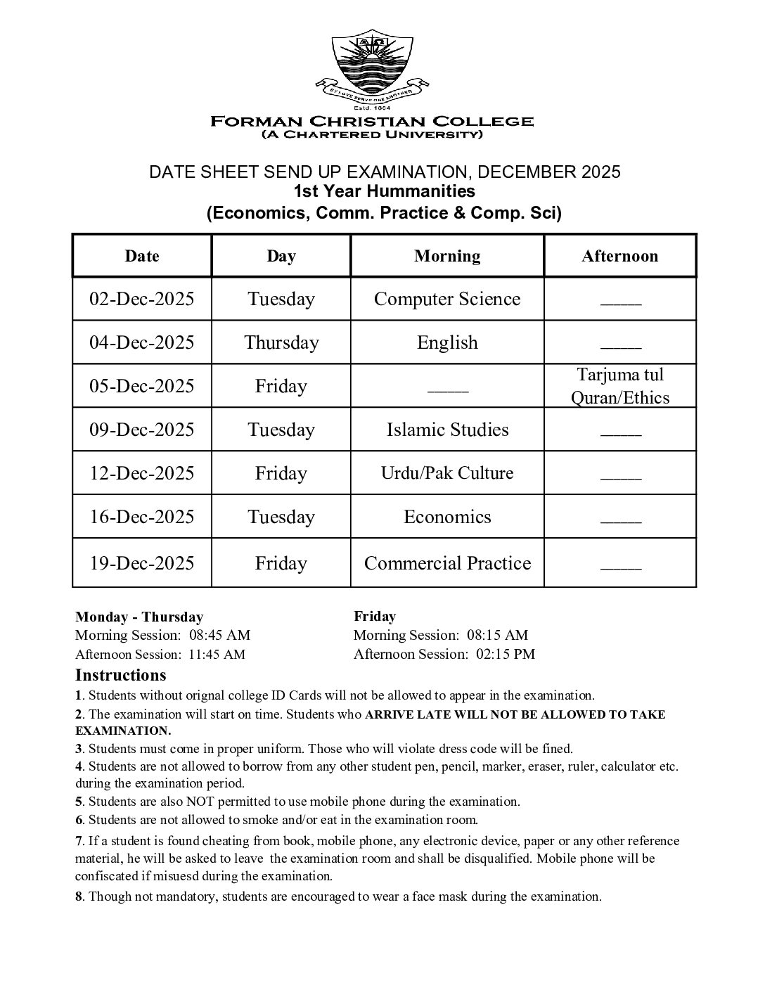 Date Sheets of 1st & 2nd Year Send Up Examinations December 2025