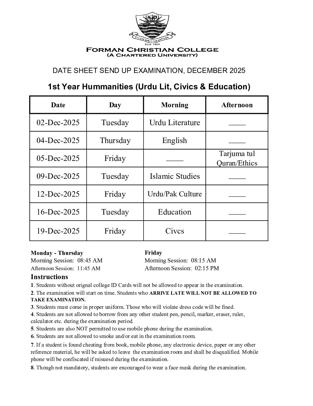 Date Sheets of 1st & 2nd Year Send Up Examinations December 2025