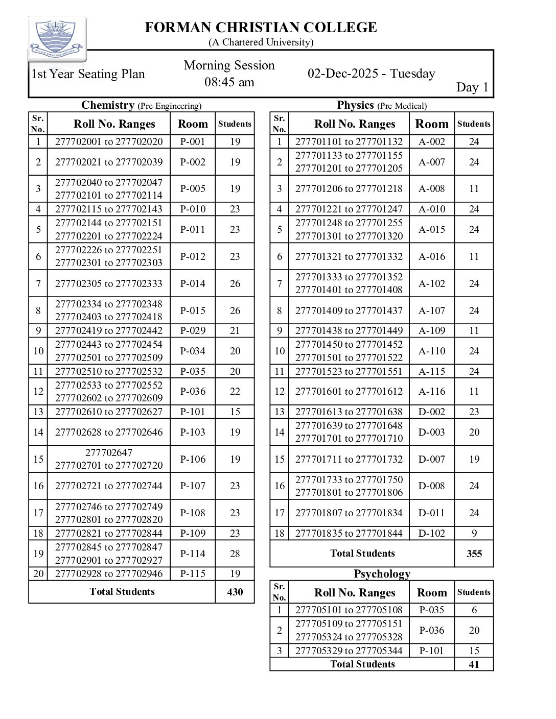 1. I Year Seating Plan 02-December-2025 - Forman Christian College