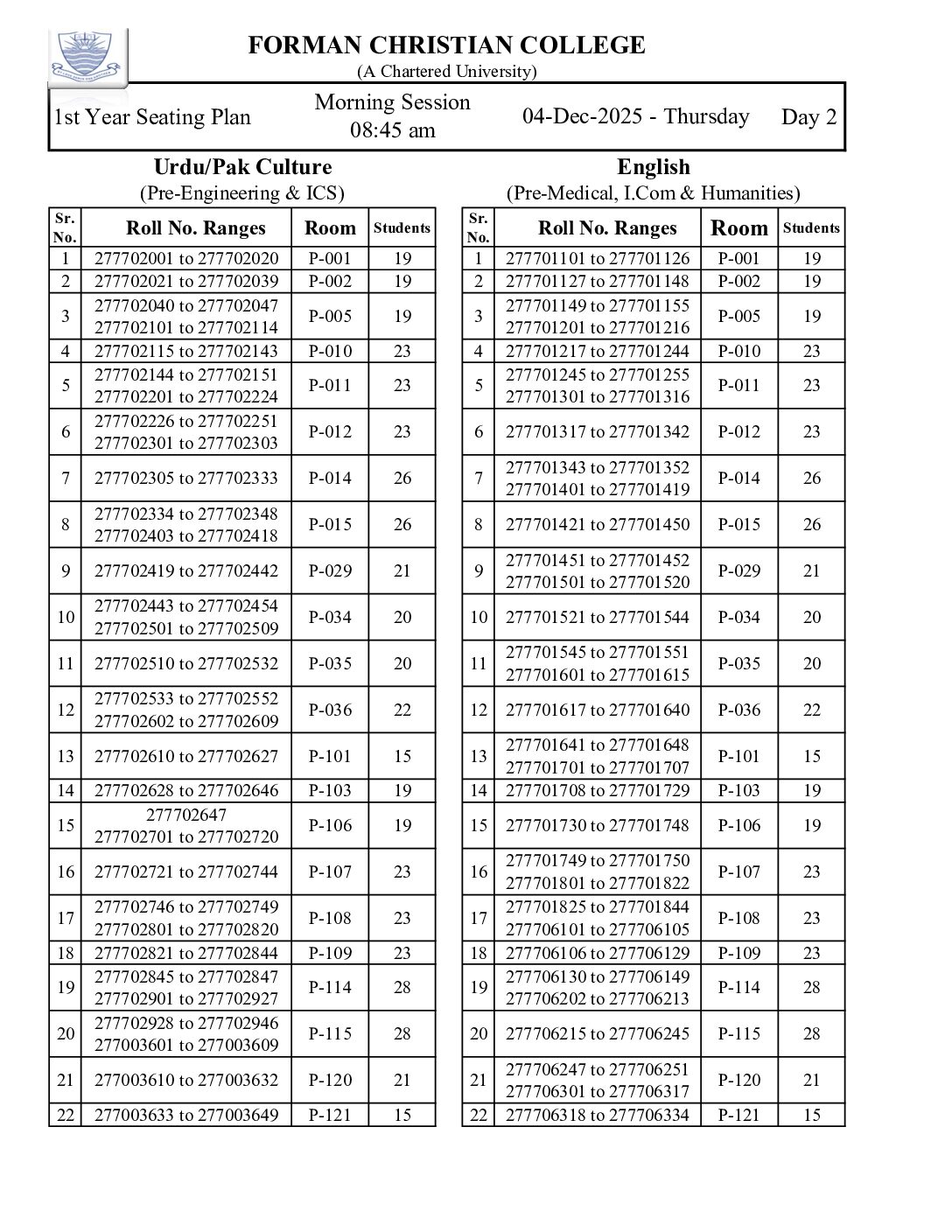 2. I Year Seating Plan 04-December-2025